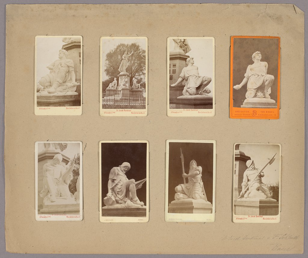 Bezeichnet recto unten Mitte auf dem Trägerkarton: Druckschrift: St. Jacob Denkmal Bezeichnet recto unten links auf dem Trägerkarton: Druckschrift: Varady & Comp. Bezeichnet recto unten rechts auf dem Trägerkarton: Druckschrift: Phot.Atelier in Basel. Bezeichnet verso auf dem Trägerkarton: Druckschrift: Inschrift auf der Rückseite des St.Jacobdenkmals, IN BASEL., AM XXVI.AUGUST MCCCCXXXXIV, STARBEN IM KAMPFE, GEGEN, FRANKREICH & OESTERREICH, UNBESIEGT, VOM SIEGEN ERMÜDET, DREIZEHNHUNDERT, EIDGENOSSEN UND VERBÜNDETE, BERNER GLARNER, LUZERNER ZUGER, URNER SOLOTHURNER, SCHWYZER NEUENBURGER, UNTERWALDNER BASLER, DAS GANZE HEER., GESTIFTET VON DEN BÜRGERN BASELS, AM XXVI. AUGUST MDCCCLXXII.