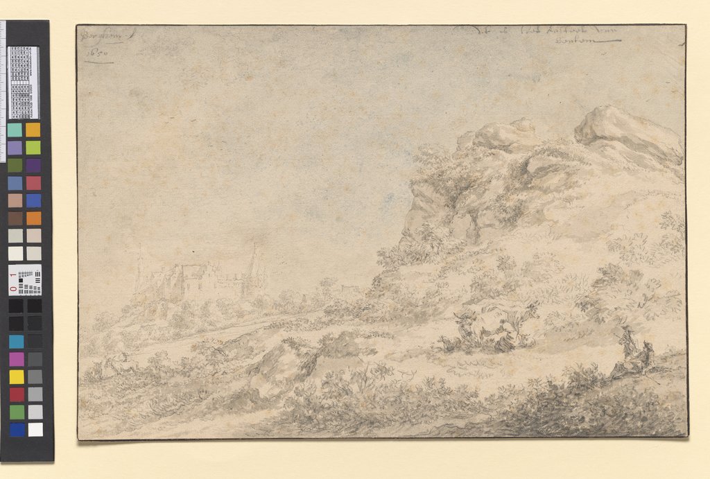 Links Schloss Bentheim, rechts ein Felsen und dabei eine Melkerin, 1650