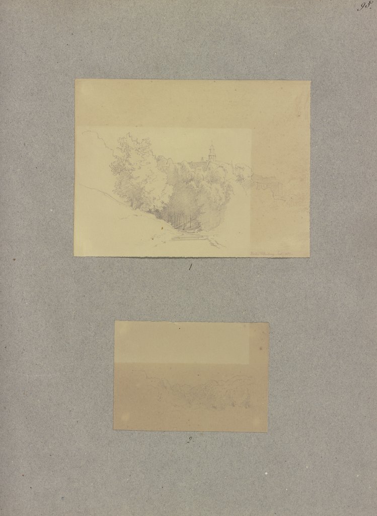 Landweg, auf das hinter Bäumen gelegene Kloster Altenberg zuführend, Carl Theodor Reiffenstein